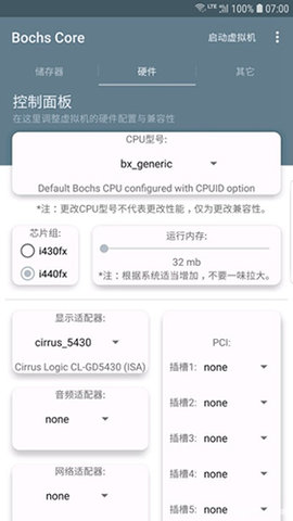 3. 完整的周边设备与交互模拟: 一台可用的电脑离不开外设交互和数据交换。BochsCore不仅模拟了核心硬件,还细致地模拟了完整的周边环境。它支持模拟PS/2接口的键盘和鼠标、软盘驱动器、CD-ROM光驱,让那些依赖特定外设的怀旧程序得以正常运行。它提供了与主机安卓系统的桥梁功能,如建立共享文件夹,实现虚拟机和手机之间便捷的双向文件传输;模拟声卡,让虚拟机内的多媒体应用能够输出音频,极大地提升了虚拟机的实用性和用户体验。