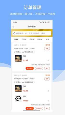 2. 全流程订单高效处理: 解决订单处理繁琐、易出错、跟进难的痛点。从客户下单、支付成功到订单确认、分拣打包、发货出库、物流追踪,直至最终完成,整个流程都在APP中清晰呈现。商家可以批量处理订单,快速打印面单,极大地减少了手动录入和核对的时间。实时跟踪每一笔订单的状态,确保订单能够被及时、准确地处理,从而显著提升发货速度和客户购物体验,降低运营成本。