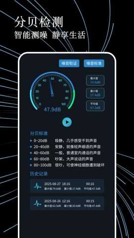 在当今快节奏的现代生活中,噪音污染已成为影响人们生活质量与身心健康的重要因素之一,从繁忙街道的交通鸣笛到邻里装修的施工声响,从办公室的持续低嗡到公共场所的嘈杂人声,无处不在的噪音不仅干扰我们的工作与休息,长期暴露更可能引发压力、焦虑甚至听力损伤。拥有一个能够精准、便捷地量化并管理周边声音环境的工具显得尤为重要。噪音测试器正是一款应运而生的专业移动应用,它如同一位随身携带的声音卫士,将智能手机的麦克风转化为精密的声学测量仪,让每一位用户都能直观掌握所处环境的噪音水平,从而主动采取应对措施,为自己营造一个更宁静、健康的生活与工作空间。