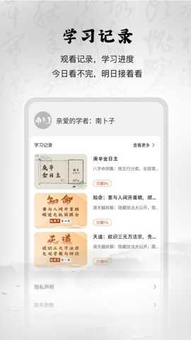 3. 个性化学习进度追踪与激励体系: 为应对用户自学过程中容易产生的懈怠与迷茫,南卜子设计了贴心的学习管理功能。系统会自动记录用户每日的学习轨迹、课程完成度与时长,形成可视化的学习进度报告。用户可以随时回顾自己的成长历程,这种即时的反馈不仅能清晰反映学习成效,更能形成正向激励,促使学习者保持持续学习的动力,逐步提升水平。