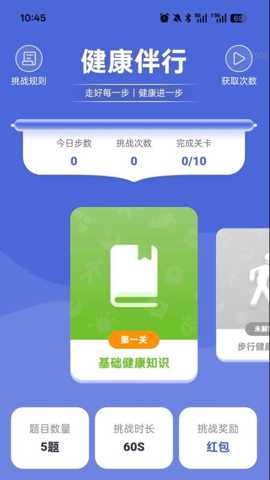 2. 互动式健康知识学习与挑战:面对健康信息繁杂、用户学习动力不足的普遍问题,软件设计了独特的知识闯关系统。它将专业的健康知识(如正确步行姿势、腰椎保护要点)转化为有趣的问答关卡。用户通过挑战答题不仅能巩固所学,成功通关后还可获得红包奖励,而挑战机会可通过观看广告获取。这一功能巧妙地将学习、验证和激励融为一体,解决了用户知道重要但懒得学的惰性,让获取健康知识变得像游戏一样充满吸引力。