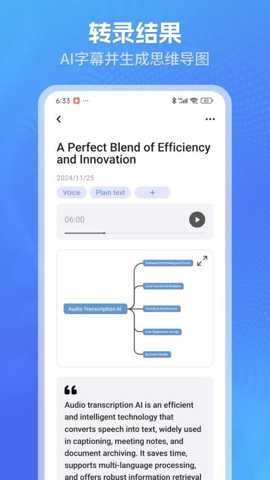 3. 文本摘要与思维导图生成:面对冗长的会议录音或复杂的讲座内容,提取核心信息往往费时费力。柠译的智能摘要功能解决了这一痛点。它能对长篇的录音文本进行深度分析,自动提炼出关键要点和中心思想,并生成结构清晰的文本摘要。更令人印象深刻的是,它还能将这些摘要以视觉化的思维导图形式呈现出来。这种图文结合的方式,帮助用户(尤其是研究人员、学生和企业管理者)快速理清逻辑脉络,抓住核心观点,极大地提升了信息消化和知识整理的效率。