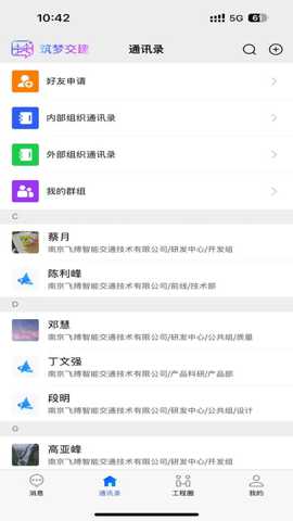 1. 智能化人员与组织管理,一键触达关键角色: 对于项目管理者而言,快速找到并联系到正确的负责人是解决问题的第一步。传统通讯录信息分散、更新不及时,常常导致找人难。筑梦交建彻底解决了这一问题。软件在项目创建之初,便能根据预设的项目结构,自动导入并生成涵盖内外部所有相关方(如甲方、设计院、总包、分包、监理等)的完整组织通讯录,用户无需手动繁琐录入。它支持按照部门、项目角色、合作单位等多维度进行智能分组与筛选。无论是需要联系某位特定的结构设计师,还是需要召集某个分包单位的所有现场负责人,用户都能通过精准筛选或搜索功能,瞬间定位目标人员或团队,极大提升了沟通发起效率,避免了因找人而浪费的宝贵时间。