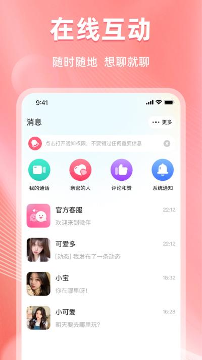 2. 高质量视音频交流,解决沟通不深入的难题: 文字聊天有时难以传递真实的情感和语气。微伴提供了高清稳定的视频通话和流畅清晰的语音聊天功能,借助优化的音视频传输技术,保障了实时互动的流畅体验。这项功能让用户可以跨越地理距离,实现面对面的交流,通过表情、眼神和语气更直观、更真实地了解对方,极大地促进了情感的升温与关系的深化。