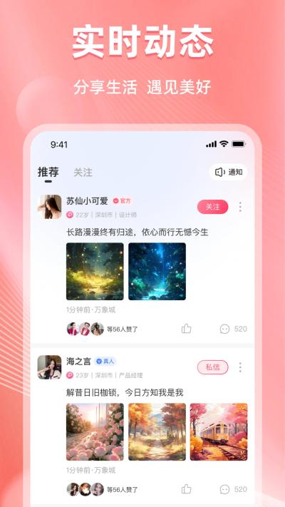 4. 兴趣动态分享与智能破冰,解决如何开始并维持交流的难题: 平台设有类似朋友圈的动态广场,用户可以通过发布图文、短视频来分享生活点滴,这为他人提供了深入了解自己生活与审美的窗口,是发现同好、自然开启话题的绝佳场景。针对初次交流可能出现的尴尬,系统提供了智能破冰辅助工具,根据双方的共同兴趣点推荐合适的话题和开场白,有效降低沟通门槛,让对话从一开始就能自然、流畅地展开。