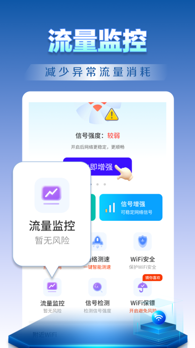 3. 全面安全防护,守护网络私域: 家庭或办公室Wi-Fi被他人蹭网,会导致网速下降、隐私泄露甚至网络安全风险。软件集成了WiFi保镖和防蹭网检测功能。它可以对当前连接的网络进行安全分析,识别网络中已连接的设备。一旦发现陌生或未经授权的设备接入,会及时向用户发出警报,并提供相应的管理建议。这有效帮助用户掌控局域网接入权限,保护个人网络资源与数据安全,营造一个私密、高效的网络环境。