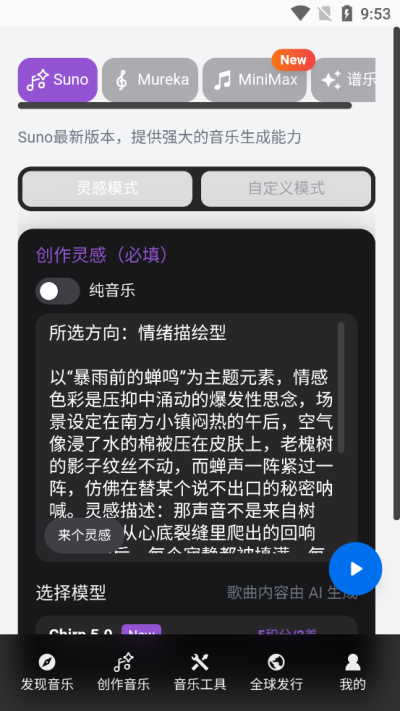 谱乐AI app的功能设计紧密围绕用户在实际创作中遇到的核心痛点,提供了从灵感激发到成品输出的完整解决方案,具体可分为以下四大项: