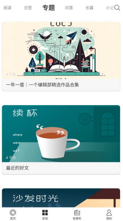 2. 多元化内容体系探索: 通过发现栏目,软件系统化地整合了多个优质内容板块,包括深度阅读、图文故事、专题策划、热搜榜单、问答互动、音乐推荐及影视资讯等。这一功能结构性地解决了用户对多元化文艺内容(从文字到音乐、影像)的一站式获取需求,无论是想读一篇小说、听一首好歌,还是看一篇影评,都能在这里轻松找到。