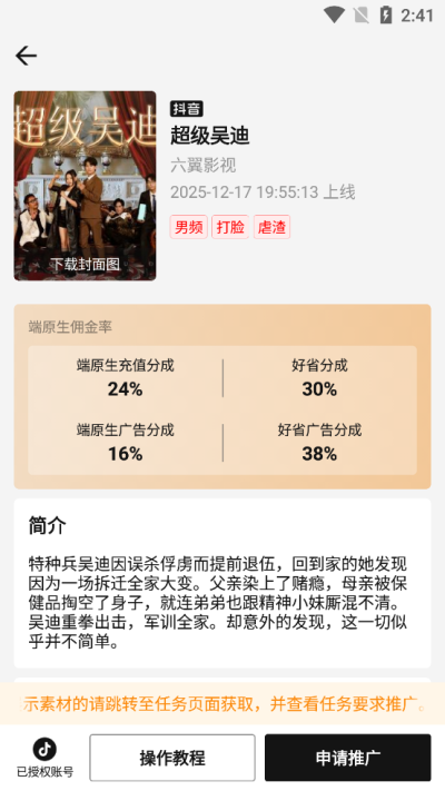 1. 正版资源获取与授权保障,解决素材从哪来,如何不侵权的难题。 创作者最大的焦虑往往源于版权风险。剧里剧外聚合了全网大量热门、高转化率的正版短剧,形成庞大的版权资源池。用户无需四处搜寻或冒险使用来路不明的素材,在App内即可按题材(如逆袭、霸总、甜宠、悬疑)浏览和筛选剧目。最关键的是,平台提供一键申请授权服务,创作者可以直接在App内完成对抖音、快手、视频号等平台的官方推广授权申请,从根本上规避了因侵权导致的视频下架、账号限流甚至封禁的风险,为长期、稳定的创作扫清了最大的障碍。