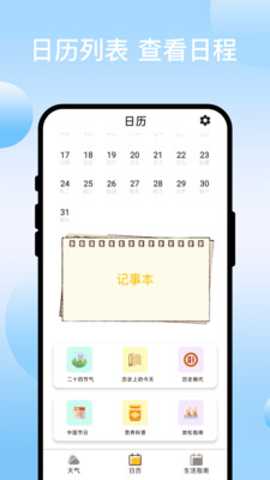 2. 智能日历与场景化提醒,升级生活规划体验:现代人日程繁忙,需要工具来帮助统筹。绘彩天气内置的智能日历功能,允许用户标记会议、约会、旅行等重要日程。其独特之处在于能与天气数据智能联动。当您在日历中添加了周末公园野餐,应用会结合该时间段的天气预报,主动推送提醒:周末晴间多云,气温适宜,建议进行户外活动,但紫外线较强,请注意防晒。 这种场景化的贴心提示,将天气信息真正融入了生活决策,解决了用户知道天气但不知如何行动的困惑。