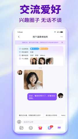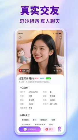 2. **资料透明与真人认证**:在虚拟网络中,真实性与安全性是用户的首要关切。享趣聊允许用户自由浏览他人详细的个人资料,包括基本信息、生活照片及兴趣标签,帮助用户在互动前做出初步判断。平台强制推行真人认证功能,用户通过上传资料完成验证后,会获得专属认证标识。这一功能从根本上减少了虚假信息和诈骗风险,解决了用户对交友对象身份真实性的信任焦虑,营造了干净可靠的社交环境。