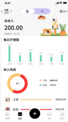 2. 多维可视化数据分析: 单纯的流水账列表难以揭示财务全貌。花喵记账的图表专区,正是为了解决用户看不懂数据、理不清结构的需求而设。系统会自动将用户的账单信息进行汇总统计,并生成饼状图、柱状图、趋势曲线等多种形式的可视化报表。用户可以直观地看到在特定周期内(如本月、本季度、本年),自己的钱主要花在了哪些方面,各项支出的占何,以及收入与支出的变化趋势,从而精准定位消费黑洞,为调整消费策略提供数据支持。