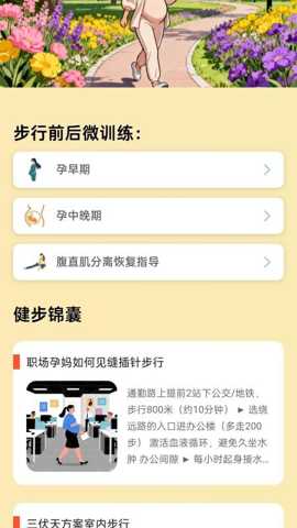 2. 个性化孕期步行训练指导:对于孕期女性,安全、适度的运动至关重要。逍遥健步乐深度洞察这一特殊需求,提供专业的孕期步行训练方案。用户可根据自身孕周设定信息,软件会据此生成个性化的运动建议,包括步行时长、频率和强度等。这些指导严格遵循孕期运动安全准则,确保用户在增强自身体质、缓解孕期不适、控制体重健康增长的最大程度保障胎儿的安全,促进母婴共同健康。