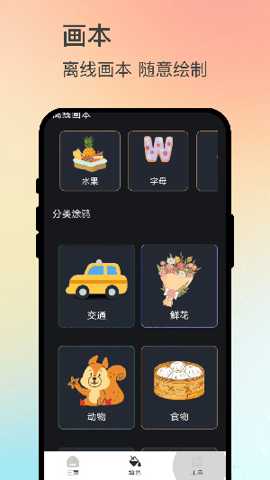 1. 多元绘画模式,满足全场景创作需求:绘梦艺笔深刻理解用户在不同情境下的创作需求。对于追求自由表达的用户,它提供了强大的空白画布和丰富的笔刷工具,支持照片临摹和自由绘画,让想象力不受拘束。对于希望练习或寻找灵感的用户,特别是儿童绘画启蒙,软件内置了跟图绘画模式和大量分类涂鸦模板(如水果、字母等主题),即使离线也能使用,引导用户一步步完成作品,有效降低了绘画门槛,提升了学习乐趣和成就感。