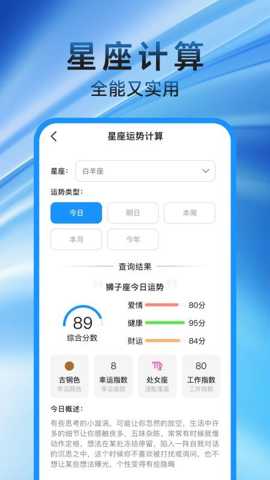 4. 趣味探索与知识拓展: 独特地融入了文化娱乐元素,满足用户的精神需求。星座运势查询功能,让用户通过输入出生信息,获得每日或每周的运势解读,为生活增添一丝趣味和期待感,辅助用户保持积极心态。而历史上的今天功能,则像一个微型的历史博物馆,每天为用户推送历史上同一天发生的重要事件,寓教于乐,既能增长见识,又能引发对历史长河的思考,极大地增强了软件的粘性和可玩性。