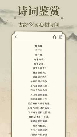 4. 便捷分享与社交互动:解决独学无友、交流不畅的问题。 学习诗词的乐趣在于共鸣与分享。软件内置便捷的分享功能,用户可以将喜欢的诗词、精彩的赏析或自己的感悟,一键分享至微信、微博等社交平台,与好友共同品鉴。这不仅能促进用户之间的文化交流,激发讨论,也能让传统文化在社交互动中焕发新的活力。通过分享,个人的阅读体验得以延伸,形成了以诗会友的良性互动圈层。