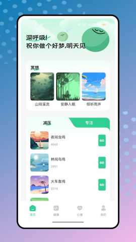 2. 沉浸式压力释放与情绪调节: 面对普遍存在的焦虑、烦躁情绪,软件提供了创新的声音疗愈与正念冥想功能。用户可以从多种自然声音(如雨声、海浪、白噪音)或引导语音中进行选择,创建个性化的放松环境。结合专业的正念呼吸、身体扫描等冥想练习,这些功能能有效引导用户将注意力从纷繁的思绪中转移,深度放松神经系统,从而高效释放累积的压力,平复情绪波动,恢复内心的平静与专注力。