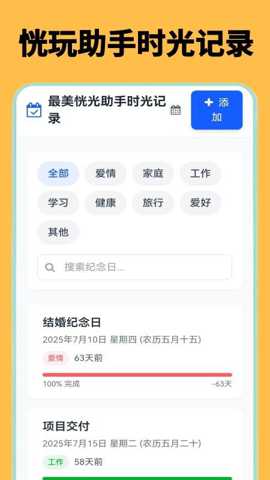 三、 智能事项与纪念日管理,关怀用户生活点滴: 现代人需要记忆的重要日期和待办事项繁多,容易遗漏。恍玩助手并非只是一个游戏应用,它还内置了一个贴心的事项与纪念日管理模块。用户可以按照爱情、家庭、工作、学习等维度分类记录重要事项,并添加诸如结婚纪念日、项目截止日等特殊日期。软件会清晰显示倒计时或已耗时状态(如项目交付还剩15天),帮助用户更好地规划时间、梳理生活,铭记每一个有意义的时刻。