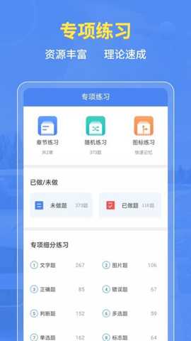 1. 多元化智能练习模式: 针对用户不同的学习阶段和需求,软件提供了多种练习模式。顺序练习帮助用户系统性地通读所有题目;随机练习模拟考试的不确定性,锻炼临场反应能力;专项练习则允许用户针对自己的薄弱环节,如交通信号、违法行为处罚等特定章节进行集中攻克。这种设计解决了用户盲目刷题、重点不清的问题,让学习过程有的放矢,大幅提升复习效率。
