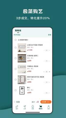 3. 便捷的一站式购物流程: 艺窠购简化艺术品交易中复杂的环节,解决传统购买流程繁琐的痛点。从快速手机号验证登录,到直观的我想要或加入购物车操作,再到集成化的购物车管理与一键结算,整个流程清晰流畅。平台整合了安全的在线支付系统,并提供完善的物流跟踪与售后咨询服务。用户无需奔波于画廊或拍卖会,即可在指尖完成从发现、鉴赏到购买的全过程,享受与购买普通商品同样便捷、安心的体验,真正实现了艺术收藏的轻量化和平民化。