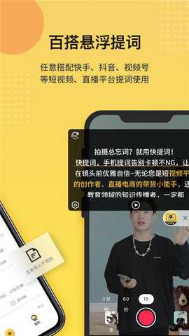 1. 智能悬浮提词,兼容多场景应用:快提词器最核心的功能是创建一个可以悬浮于其他应用之上的透明提词板。用户可以在抖音、快手、微信视频号等直播应用中,或者在使用手机自带相机、第三方专业拍摄软件录制视频时,同步看到提词内容。它解决了用户在不同平台切换时需反复查看外部稿件的麻烦,实现了拍摄/直播与提词的无缝衔接,极大地提升了多平台内容创作的工作流效率。