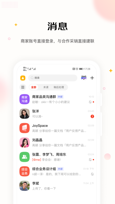 2. 跨组织精准通讯与找人: 解决找对人的难题。平台基于业务主数据(如负责的品牌、品类、项目),自动在通讯录中建立并展示京东内部相关岗位人员(如采销、运营、客服、技术)与合作伙伴的对应关系。用户无需询问或搜索微信号、手机号,即可直接找到目标联系人。它支持免好友直接对话,双方无需互加好友即可发起即时聊天、语音或视频通话,确保在促销备战、库存预警、客诉处理等紧急场景下,业务沟通能够实现秒级触达,极大提升了应急响应能力。
