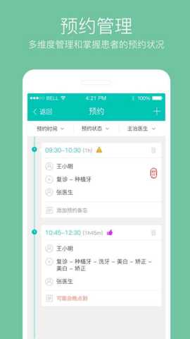 1. 智能化患者全周期管理:该功能直击口腔诊所患者信息分散、跟进不及时的痛点。软件为每位患者建立专属的电子健康档案,详细记录病史、治疗方案、影像资料、费用明细等。医生可随时调阅,制定个性化治疗计划。集成的预约系统支持在线预约、智能排班与自动提醒,有效减少爽约率。术后,系统可自动触发回访任务,确保服务闭环,提升患者满意度和忠诚度,从根本上优化了患者就医体验与诊所服务流程。