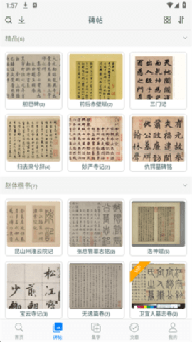 1. 海量高清真迹字库,解决看不清、找不全的痛点:软件收录了赵孟頫海量的经典作品,如胆巴碑、洛神赋、道德经等,所有字帖均源自权威版本的高清扫描或拍摄,确保笔画、墨色、飞白乃至纸张纹理都清晰可辨。这彻底解决了传统印刷字帖细节模糊、版本不全的问题,用户无需再为寻找特定字或观察细微笔触而烦恼,可以随心所欲地放大、浏览每一个字的精妙之处,为精准临摹打下坚实基础。