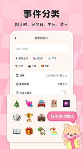 2. 个性化事件管理与标注: 针对用户记录事件多样化的需求,App内置了丰富的图标库和灵活的标注功能。用户可以为不同的倒数事件(如生日、会议、旅行)选择独特的图标,并添加自定义的文字备注。这项功能解决了传统日历事件千篇一律、难以快速识别和记忆的痛点。通过个性化的视觉标记,重要的日子在日历中一目了然,不仅让管理界面生动有趣,也显著提升了事件管理的效率和准确性。