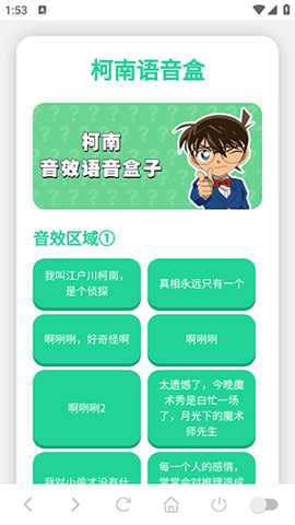 1. 一键即播,丰富社交表情:应用最核心的功能是解决用户快速调用音效进行社交娱乐的需求。用户无需经历复杂的搜索和下载流程,只需在清晰分类的界面中点击目标语音或音效按钮,即可瞬间播放。无论是想在微信群聊中发一句柯南的经典台词引爆话题,还是在朋友聚会时播放一段熟悉的破案音效活跃气氛,这个功能都能让用户轻松实现,将动漫的乐趣从个人观赏延伸至实时互动,极大地增强了社交的趣味性和代入感。