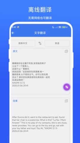 1. 一键拍照,即扫即译: 这是解决用户看不懂眼前外语信息的核心功能。用户无需手动输入冗长的外文,只需打开应用的拍照翻译功能,将摄像头对准需要翻译的文本(如餐厅菜单、公告板、文件等),软件会自动框选并识别文字,随即呈现翻译结果。这个过程快速流畅,完美解决了在旅行、购物或处理涉外文件时,因语言不通而产生的尴尬与不便,让信息获取变得像拍照一样简单。