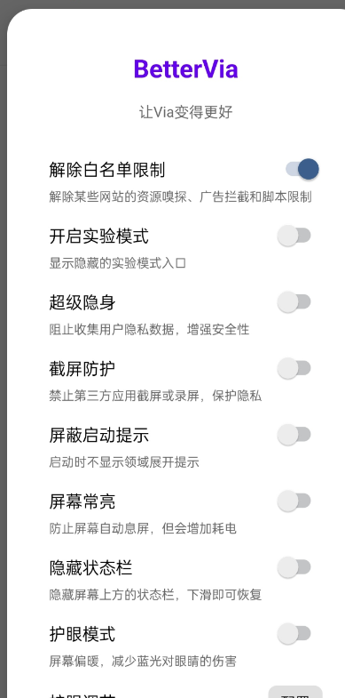 尽管BetterVia模块仍处于持续开发和完善阶段,但其简洁直观的配置界面、轻量化的存在感以及已经实现的实用功能,已经为Via浏览器用户带来了显著的体验提升。随着开发者的持续更新和社区反馈的融入,未来它有望集成更多创新特性,进一步巩固其作为Via浏览器最佳伴侣的地位,为追求极致浏览体验的用户提供源源不断的价值。