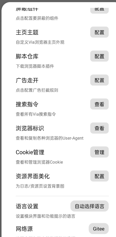 3. 深度定制与美化拓展:对于追求个性化的用户,BetterVia打破了Via浏览器在主题和功能上的部分原生限制。它支持多样化主题的一键切换,允许用户更自由地改变浏览器界面的视觉风格。该模块能够突破Via原有的白名单限制,启用诸如资源嗅探(方便下载网页中的视频、音频等资源)、用户脚本注入(安装Tampermonkey脚本以实现自动化操作或增强特定网站功能)等高级能力,极大地拓展了浏览器的可玩性和实用性。