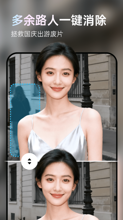 2. AI智能消除,轻松打造纯净画面: 在旅游打卡或重要场合拍摄时,背景中难以避免的路人、杂物常常破坏构图。图灵灵的智能消除引擎能精准识别并移除这些干扰元素,并利用先进的算法智能填充背景,实现毫无痕迹的包场效果。它还能有效处理玻璃反光、眼镜反光以及图片上的多余水印文字,解决了用户在拍摄展品、橱窗或人像时面临的实际困扰,轻松拯救原本可能被废弃的照片。