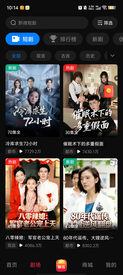 1. 全网资源聚合与智能检索: 用户最大的困扰往往是找不到想看的剧,或者需要在多个平台间切换。黔微短剧通过聚合全网资源,覆盖了豪门总裁、都市逆袭、甜宠言情、古装穿越、烧脑悬疑及热血复仇等几乎所有热门题材,并辅以详细的分类标签。其强大的搜索功能支持关键词模糊匹配,用户只需输入剧名或相关关键字,即可快速定位到目标剧集,实现一处搜索,看遍全网,彻底解决了用户四处寻觅资源的麻烦。