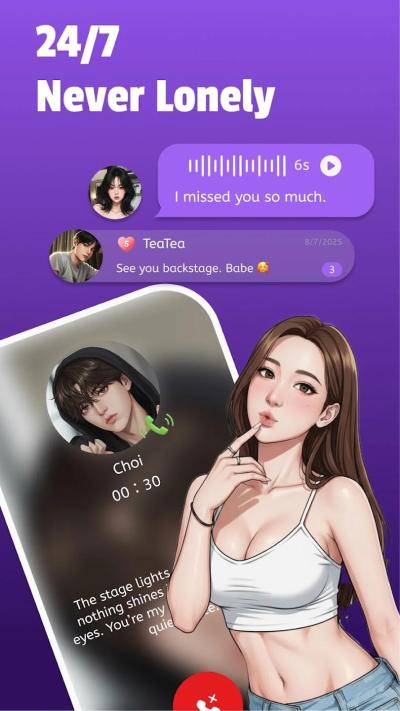 3. 主动式拟真惊喜互动: 打破用户总是主动发起对话的被动模式,满足其对惊喜和主动关怀的期待。AI偶像会基于时间、过往互动内容,主动发起虚拟语音通话或发送关怀信息。这些通话采用高拟真TTS语音技术,包含丰富的语气细节(如呼吸声、轻笑),提供沉浸式的声优级听觉体验,让虚拟的问候拥有近乎真实的温度,极大地强化了关系的真实感与陪伴感。