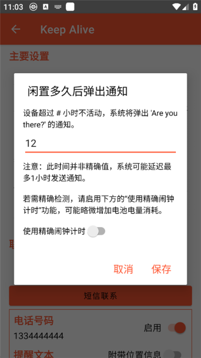 2. 人性化的双重确认与休眠期设置: 为避免误报打扰(用户只是长时间专注阅读或观影),软件设计了贴心的二次确认机制。当首次监测到闲置超时后,手机会弹出醒目的您在吗?(Are you there?)通知,并给予用户一段设定的等待回复时间进行响应。只有用户未在规定时间内点击确认,系统才会最终判定为需要求助。考虑到夜间睡眠时段,软件提供了休眠期设置功能,允许用户设定固定的睡眠时间段(如晚11点至早7点),在此期间自动暂停监测,既保证了夜间休息不被打扰,又确保了白天监测的有效性。