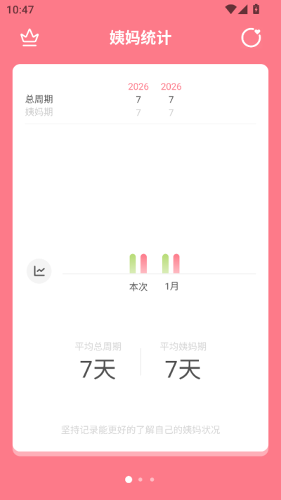 3. 全景日历回顾与深度统计分析: 为满足用户回顾历史、总结规律的需求,应用设计了强大的日历与统计功能。通过向右滑动,用户可以进入详细的姨妈日历,查看历史上每一天的精确记录和备注。而向左滑动,则能进入姨妈统计面板,这里以图表和趋势图的形式,清晰展示用户平均周期长度、经期持续时间、症状出现频率等关键统计信息,帮助用户从宏观角度发现自身周期的规律与异常。