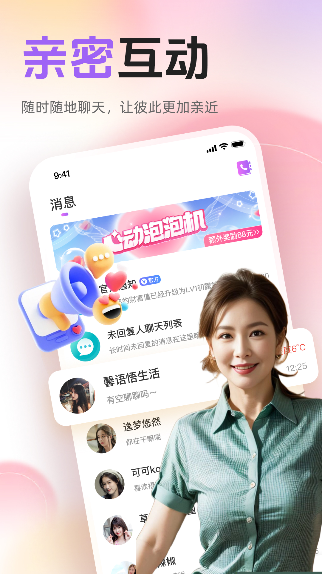 3. 多元沉浸式互动体验: 为了满足不同性格用户及社交阶段的需求,应用提供了全维度的沟通方式。其核心亮点无需加好友直聊功能,彻底打破了传统社交的申请等待门槛,让沟通发起于心动瞬间,尤其适合快节奏生活和社恐人群。在此基础上,用户可以选择文字、表情进行轻松破冰,通过私密语音连麦深化交流,更可以一键发起高清的一对一视频通话。这种从文字到语音再到视频的渐进式、沉浸式互动矩阵,能够帮助用户在建立信任的过程中自然过渡,极大地丰富了社交的层次感和亲密度。