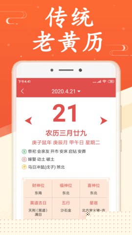 1. 权威黄历查询与解读: 针对用户在选择吉日、规避忌讳时的核心需求,软件提供了专业且易用的黄历查询功能,并非简单罗列古文术语,而是对宜祭祀、忌动土等内容进行了现代化的白话文解读,解释了其传统含义与现代适用场景,并清晰标注冲煞生肖与吉神方位。这解决了用户面对传统黄历时看不懂、不会用的痛点,让千年智慧真正能为现代决策提供参考。