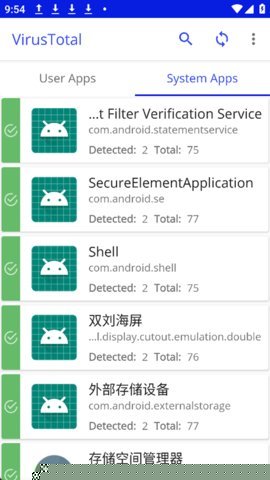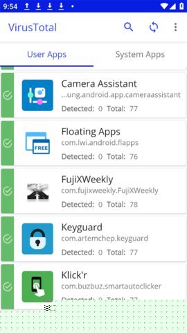 额外说明:初始使用指引 首次安装并启动VirusTotal Mobile后,软件会自动扫描设备中所有已安装的应用,并生成一个总览列表。用户可以在此列表中浏览所有应用的基本信息。点击任意应用,即可触发详细的云端查询,查看其完整的安全分析报告、权限详情和签名信息,开始您的深度设备安全探索之旅。