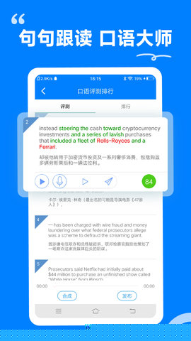 2. 全方位交互式阅读辅助:为了保障阅读的流畅性与学习深度,软件提供了强大的即时支持。在阅读界面,长按任意单词或短语,即刻弹出浮窗,显示精准释义、音标、词性和地道例句,实现即点即译,最大程度减少查词典带来的中断。每篇文章都配备高保真AI语音朗读,用户可调节语速,先通听把握大意,再精读消化细节。结合内置的录音跟读与智能评分功能,用户能直接对比自己的发音与标准音,针对性改进语音语调。