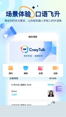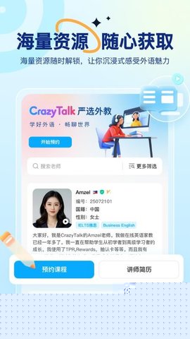 1. 解决缺乏真实对话环境的痛点:提供真人即时一对一视频教学。 这是CrazyTalk最核心的功能。用户可以直接在应用内预约来自英语母语国家的认证外教,进行实时视频对话课程。这一功能彻底解决了传统自学或大班课中开口机会少、缺乏即时反馈的问题,为用户创造了一个高度沉浸、必须运用语言进行真实信息交换的场景,从而有效锻炼临场反应与连贯表达能力。