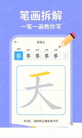 动态笔画与笔顺精讲功能,直击书写入门难题。对于初学汉字的孩子而言,笔画的形状、顺序和结构是三大难关,内置强大的汉字书写引擎,能将每一个汉字拆解为独立的笔画,并以清晰的彩色动画逐笔演示书写过程,包括起笔、行笔、收笔的完整路径。孩子可以反复观看,直观理解先横后竖、先撇后捺等基本笔顺规则,从源头杜绝倒笔画等错误习惯的养成,为写好字打下坚实基础。