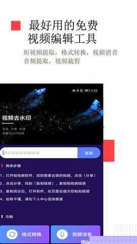 荣发免费去水印是一款专为移动端设计的全能型视频处理工具。其核心使命是帮助用户打破平台壁垒,便捷地获取并净化来自各大社交媒体的短视频内容,的设计哲学是简单、高效、免费将复杂的视频解析、水印擦除、音视频分离及基础编辑功能,整合进一个直观易用的界面中。用户无需具备专业的视频处理知识,也无需在多个应用之间来回切换,仅需简单的几步操作,即可完成从视频链接获取到最终成品导出的全过程,不仅是去除水印的利器,更是一个轻量级的移动视频工作站,极大地提升了用户处理短视频内容的效率和体验。