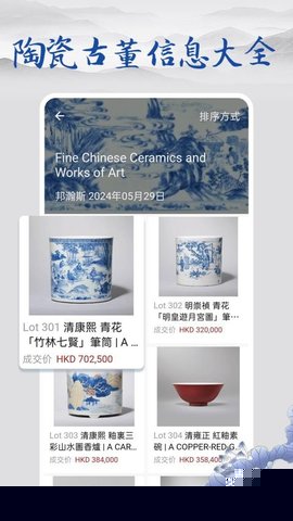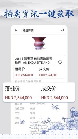 其一,全球市场动态一手掌握。 软件与苏富比、佳士得、中国嘉德等国内外顶级拍卖行建立了稳定的数据通道,实现了重要拍卖会的预展信息、拍品高清图录及最终成交价格的实时同步与历史归档。这解决了用户以往需要多方搜寻、信息滞后的痛点,帮助用户第一时间把握市场风向,为收藏决策提供关键的数据支持。