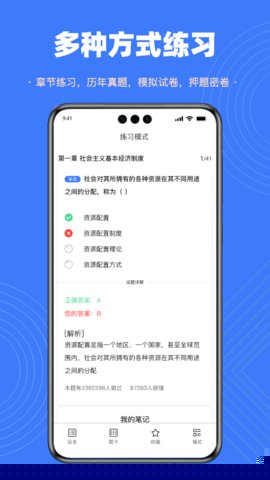 三、 多维度的能力强化与评估工具: 为了帮助用户克服知识点会但考不好的困境,软件提供了丰富的练习与测评模式。除了常规的顺序练习和章节专练,更有高度仿真的限时模拟考试,全面还原考场氛围与压力。独立的错题本功能会自动收集所有错题,并支持一键生成错题重组卷,便于针对性攻克顽固失分点。可视化的学习报告,如正确率趋势图、知识点掌握度雷达图,让进步清晰可见,复习方向一目了然。