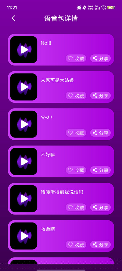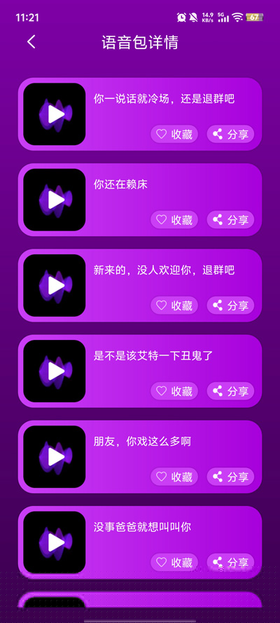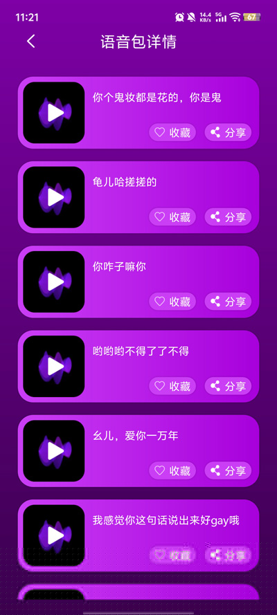 2. 海量情景化语音包与便捷分享: 解决了用户在社交互动中需要快速调用趣味素材来活跃气氛或精准表达的需求,提供了分类清晰的精选语音包库,内容囊括二次元动漫台词、影视剧经典对白、网络热门搞怪段子、明星同款声音等,种类繁多。在聊天过程中,用户可以一键点击播放选中的语音包,瞬间输出趣味内容。为了方便社交传播,软件支持将有趣的语音包直接发送至第三方社交平台,无论是整蛊好友还是作为聊天开场白,都能轻松实现,极大地降低了创造欢乐氛围的门槛。