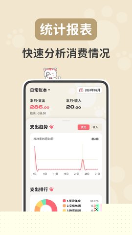 3. 深度可视化数据分析:喵钱记账内置强大的统计引擎,能够基于用户的记账数据,按日、周、月、年或自定义周期生成多种可视化图表。消费结构环形图可以直观展示钱花在了哪里,消费排行榜能快速定位支出最多的类别,而对比图表则有助于分析不期的消费差异。这些深入浅出的分析报告,极大地降低了用户理解复杂财务数据的门槛,使其能够轻松洞察自身的消费偏好与潜在问题,为优化消费结构提供数据支持。