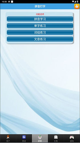 2、用户可以通过点击屏幕下方的五笔按键,进入五笔打字的练习界面,进行拼音、单字、词组、文章的练习。